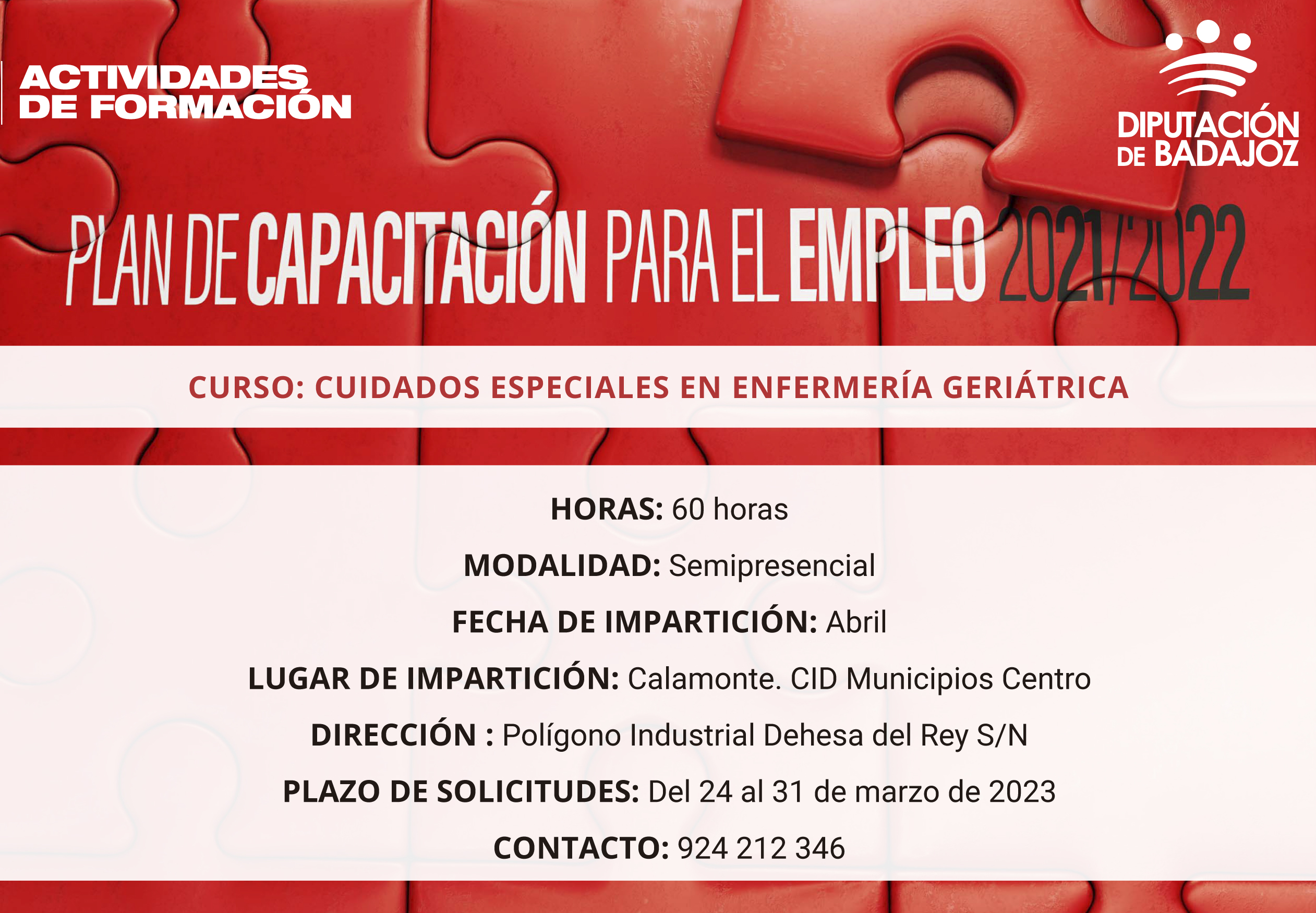 La Diputación de Badajoz, a través del Plan de Capacitación para el Empleo 2021-2022, desarrollado por el Servicio de Capacitación para el Empleo, dependiente del Área de Desarrollo Rural, Reto Demográfico y Turismo de la Diputación de Badajoz, abre el plazo de solicitudes para participar en la acción formativa gratuita en ‘‘Cuidados especiales en enfermería geriátrica’’, para dar comienzo el próximo mes de abril en el CID Municipios Centro de Calamonte.
