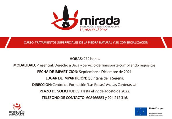 La Diputación de Badajoz, a través del Proyecto MIRADA (Motivación e Inserción Laboral Diputación Activa), desarrollado por el Servicio de Capacitación para el Empleo, dependiente del Área de Desarrollo Rural, Reto Demográfico y Turismo de la Diputación de Badajoz, va a iniciar una acción formativa en ‘’Tratamientos superficiales de la piedra natural y su comercialización’’ en la localidad de Quintana de la Serena.