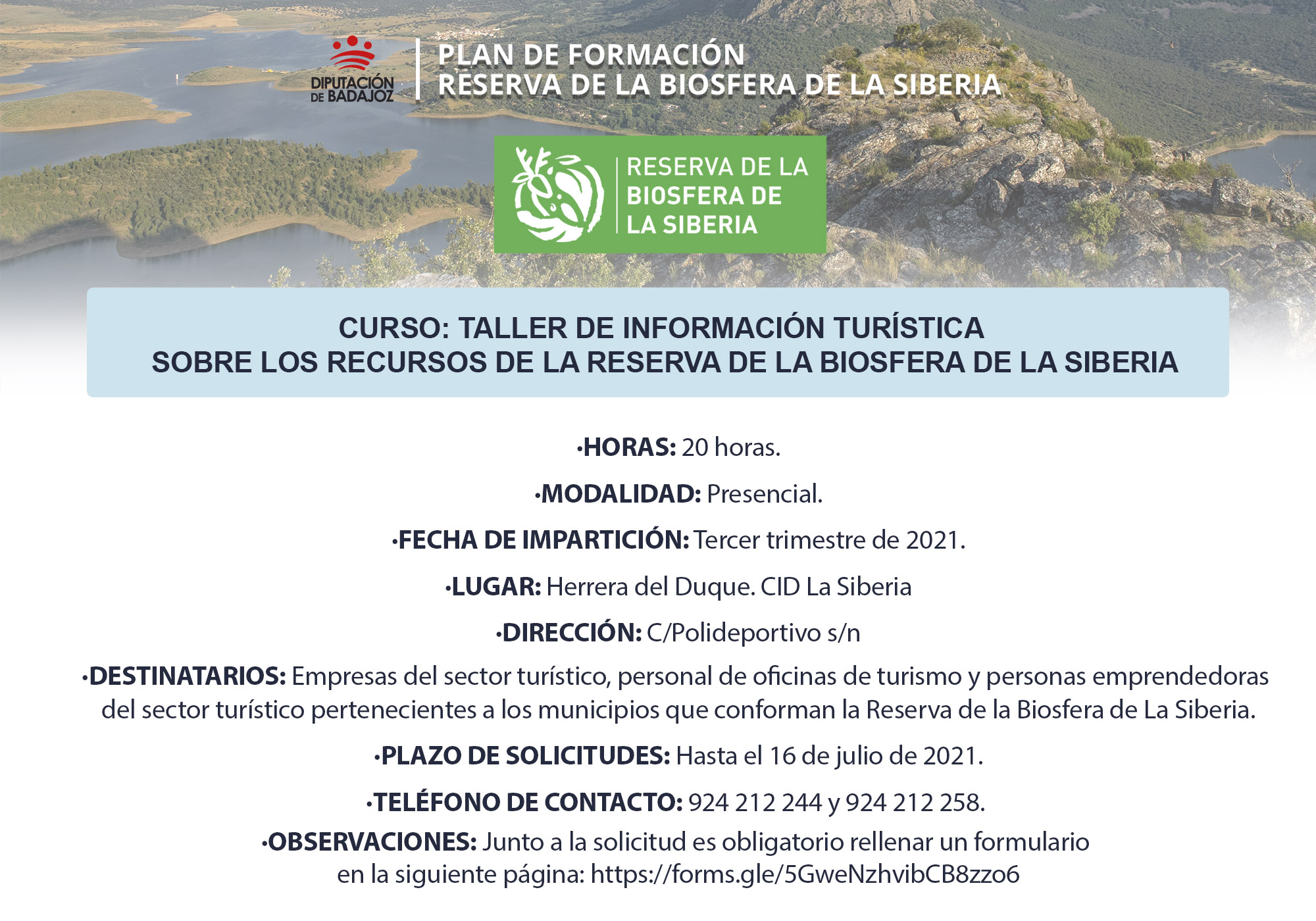 Desde el Plan de Capacitación para el Empleo Reserva de la Biosfera de La Siberia, un proyecto surgido de la colaboración entre el CEDER La Siberia, el personal técnico de la Reserva de la Biosfera y el equipo del Servicio de Capacitación para el Empleo del Área de Desarrollo Rural, Reto Demográfico y Turismo, se va a iniciar un Taller de información turística sobre los recursos de la Reserva de la Biosfera de La Siberia en Herrera del Duque.