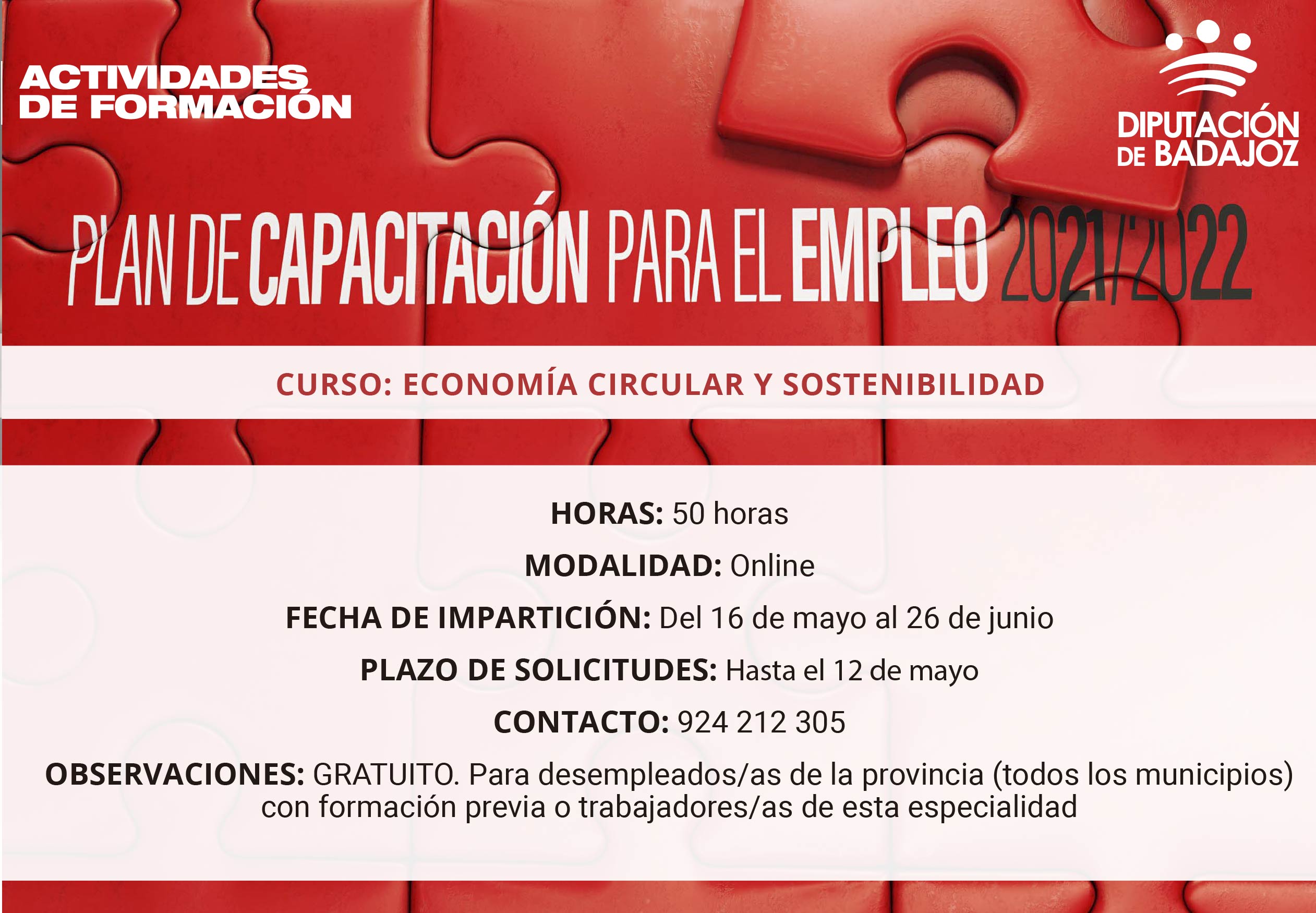 La Diputación de Badajoz, a través del Plan de Capacitación para el Empleo Local 21-22, desarrollado por el Servicio de Capacitación para el Empleo, dependiente del Área de Desarrollo Rural, Reto Demográfico y Turismo de la Diputación de Badajoz, va a iniciar una acción formativa en “Economía circular y sostenibilidad”.