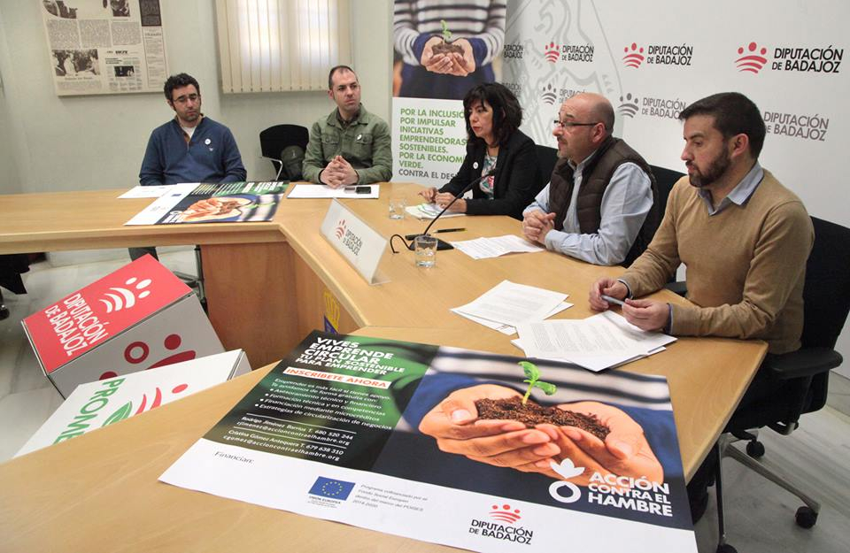 En el marco de un proyecto financiado por el Fondo Social Europeo y cofinanciado por el Área de Desarrollo Sostenible de la Diputación de Badajoz, se va a trabajar en dos itinerarios de emprendimiento inclusivo entre jóvenes, personas paradas de larga duración, perceptoras de rentas básicas de inserción, mujeres y minorías étnicas. Como zonas priorizadas para la puesta en marcha de iniciativas de ecoturismo, agricultura y ganadería con nuevas tecnologías e instalaciones para la reutilización de recursos, se han elegido Olivenza y Calamonte. Así se describe el proyecto de economía verde y circular por el que apuestan “Acción contra el hambre” y la Diputación de Badajoz y que ha sido presentado esta mañana en la institución provincial.