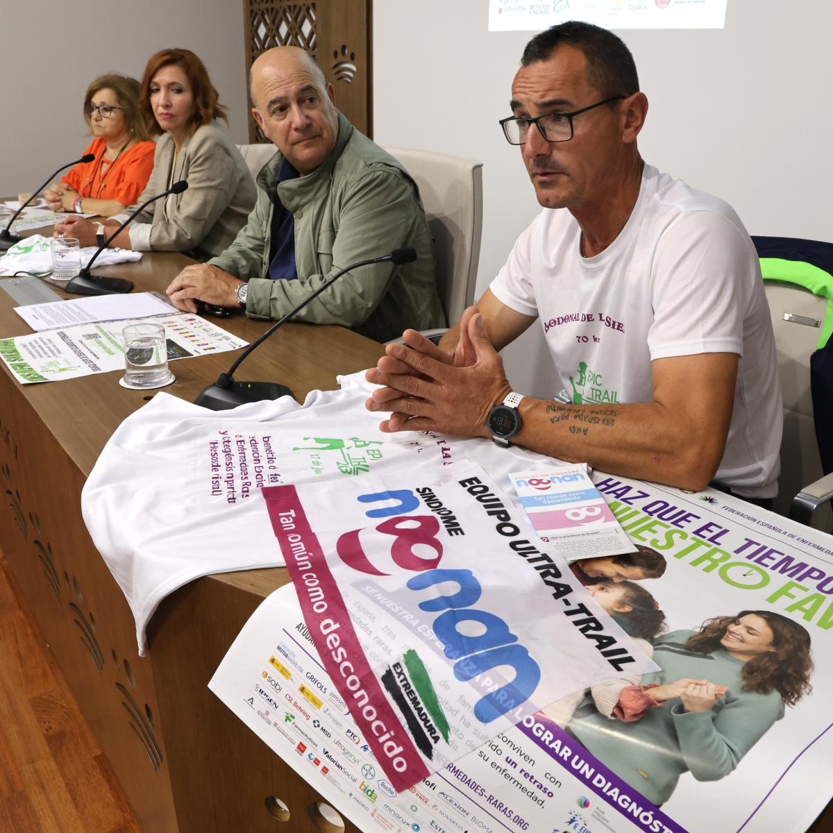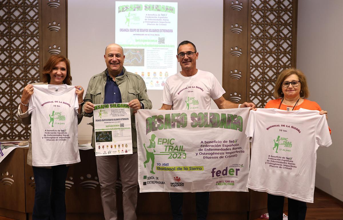 El próximo 17 de junio, tendrá lugar la tercera edición del Desafío Solidario Epic Trail, con una distancia de 70 kilómetros y un desnivel positivo de 1.200 metros pasando por los tres pueblos que alcanzan la provincia de Huelva (Cumbres Mayores, Cumbres de En Medio y Cumbres de San Bartolomé), teniendo salida y llegada en Bodonal de la Sierra. Lo han dado a conocer esta mañana en rueda de prensa el diputado delegado en funciones del Área de Desarrollo Rural, Reto Demográfico y Turismo de la Diputación de Badajoz, Lorenzo Molina, acompañado por Lourdes Linares, alcaldesa de Bodonal de la Sierra; Francisco Barragán, organizador del evento y padre una niña con enfermedad rara, y Mónica González García, de la Asociación FEDER (Federación Española de Enfermedades Raras y Osteogénesis Imperfecta).