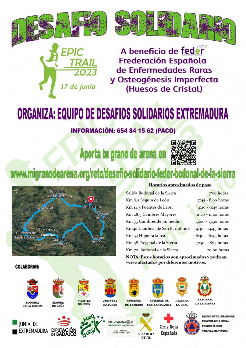 La colaboración puede hacerse bien a través de la web https://www.migranodearena.org/reto/desafio-solidario-feder-bodonal-de-la-sierra, en huchas establecidas en cada pueblo por donde transcurre la prueba. Para más información al móvil 654 84 15 62.