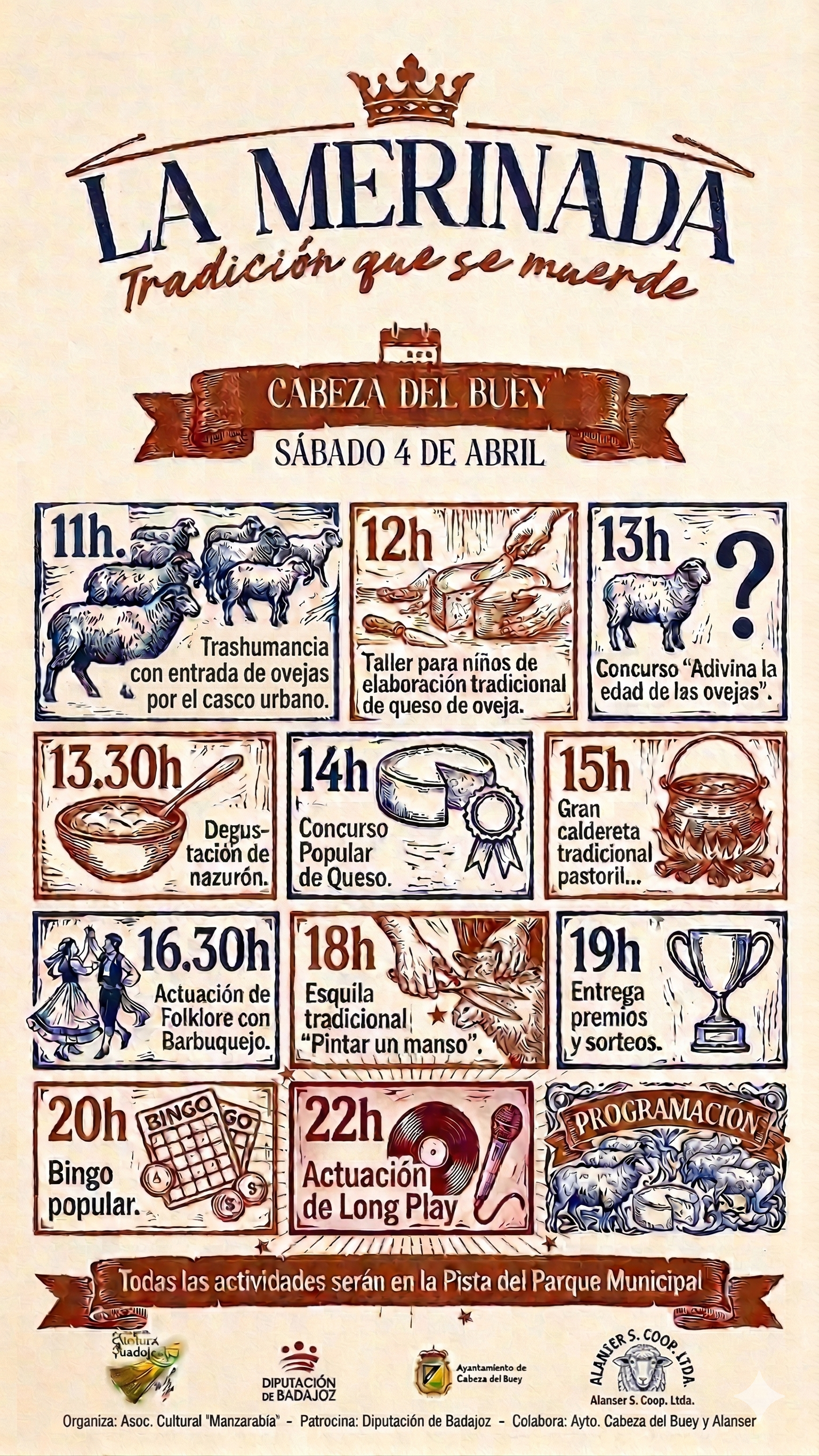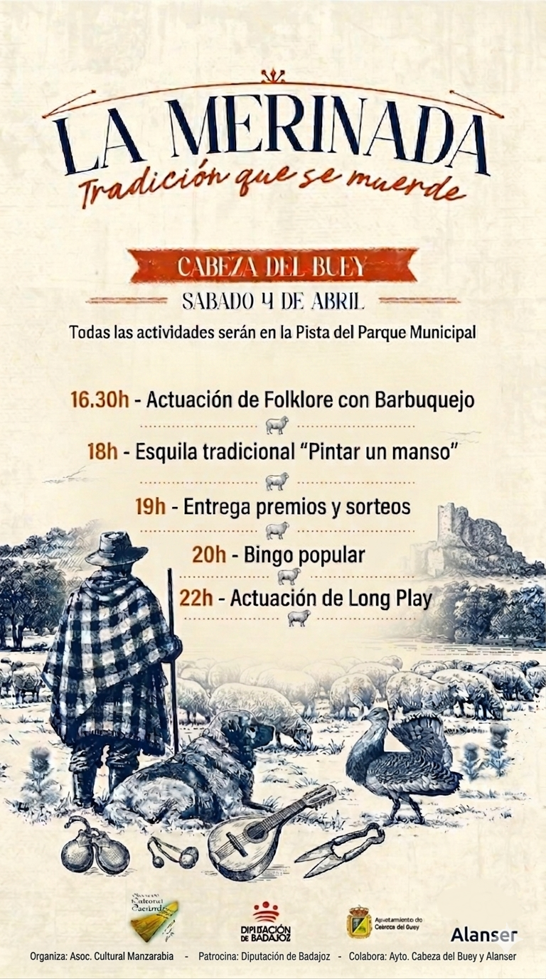 ‘La Merinada’ de Cabeza del Buey es una jornada dedicada a la puesta en valor de nuestra tradición ganadera y la gastronomía ligada al ovino, elementos fundamentales de nuestra identidad histórica, cultural y económica, además este evento pretende consolidar a la localidad como uno de los referentes gastronómicos ligados a la oveja y su aprovechamiento en Extremadura.
