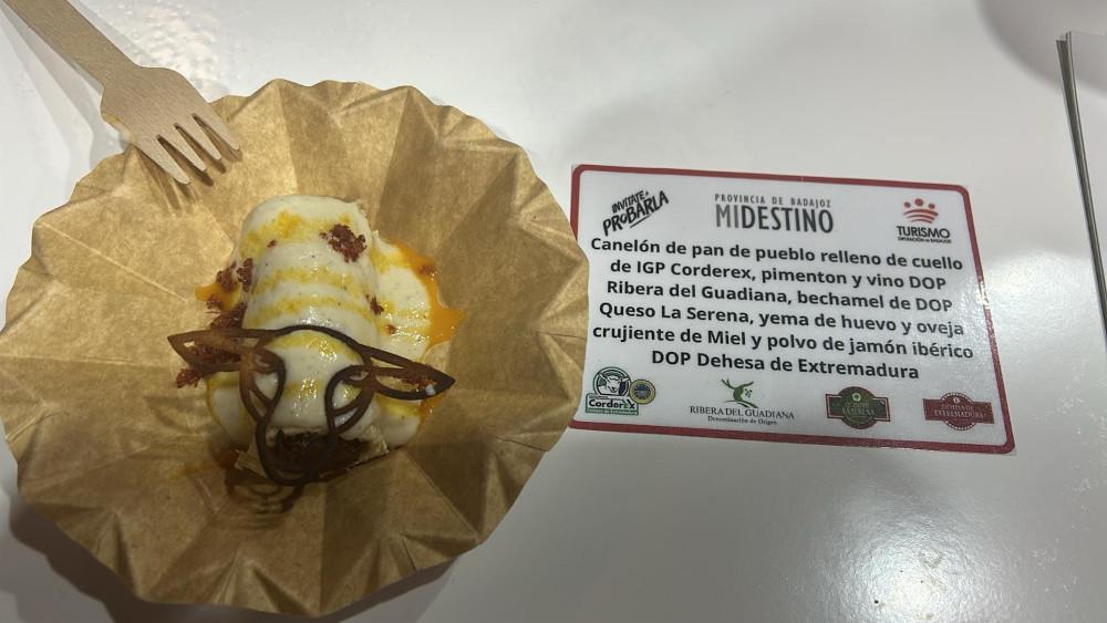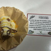 -Canelón de pan de pueblo relleno de cuellos de IGP “Corderex”, pimentón y vino DOP “Ribera del Guadiana”, yema de huevo y oveja crujiente de miel y polvo de jamón ibérico DOP “Dehesa de Extremadura”, maridado con vino DOP “Ribera del Guadiana”.