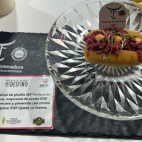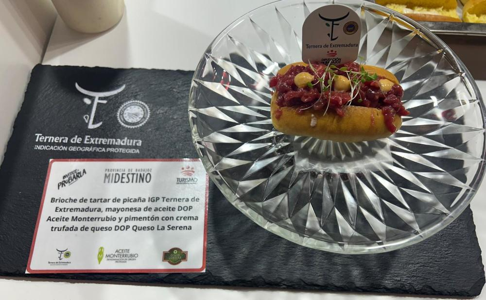 -Brioche de tartar de picaña IGP “Ternera de Extremadura”, mayonesa de aceite DOP “Aceite de Monterrubio” y pimentón y crema trufada de queso DOP “Queso de La Serena”, maridado con vino DOP “Ribera del Guadiana”.