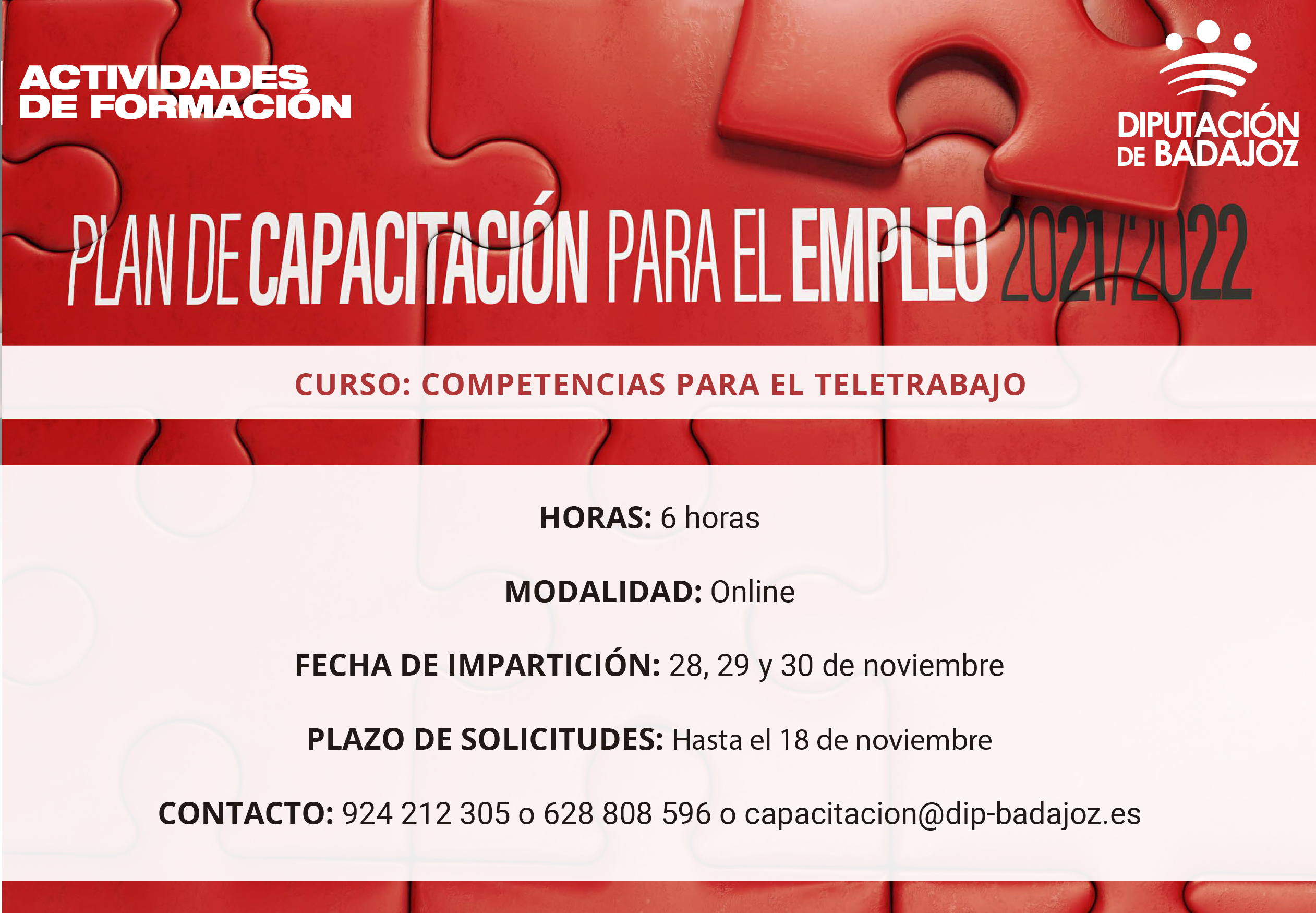 La Diputación de Badajoz, a través del Plan de Capacitación para el Empleo 2021-2022, desarrollado por el Servicio de Capacitación para el Empleo, dependiente del Área de Desarrollo Rural, Reto Demográfico y Turismo, va a iniciar la acción formativa en ‘’Competencias para el teletrabajo’’.