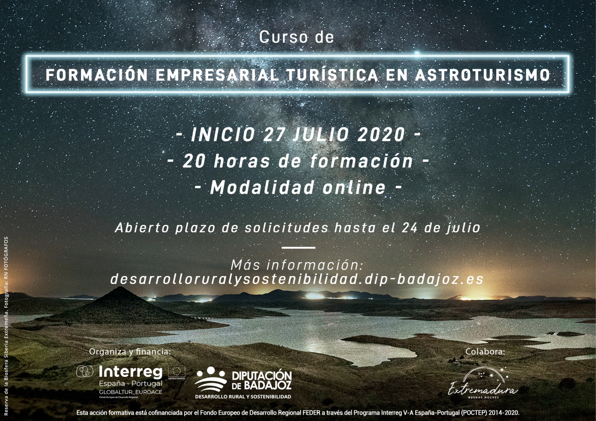 Diputación de Badajoz, a través del Área de Desarrollo Rural, Reto Demográfico y Turismo y dentro de las acciones del proyecto europeo GLOBALTUR_EUROACE (POCTEP), va a organizar un curso de formación empresarial turística en astroturismo en formato online.