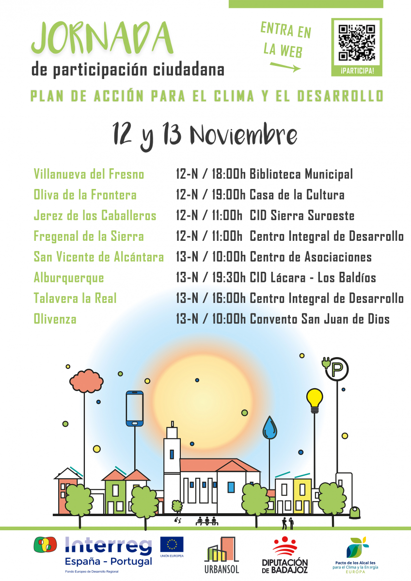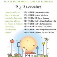Los próximos días 12 y 13 de noviembre, se desarrollarán en ocho municipios de Badajoz (San Vicente de Alcántara, Alburquerque, Talavera la Real, Olivenza, Villanueva del Fresno, Oliva de la Frontera, Jerez de los Caballeros y Fregenal de la Sierra) unas jornadas de participación ciudadana que forman parte del proceso de elaboración del Plan de Acción para el Clima y la Energía Sostenible (PACES) de cada municipio.