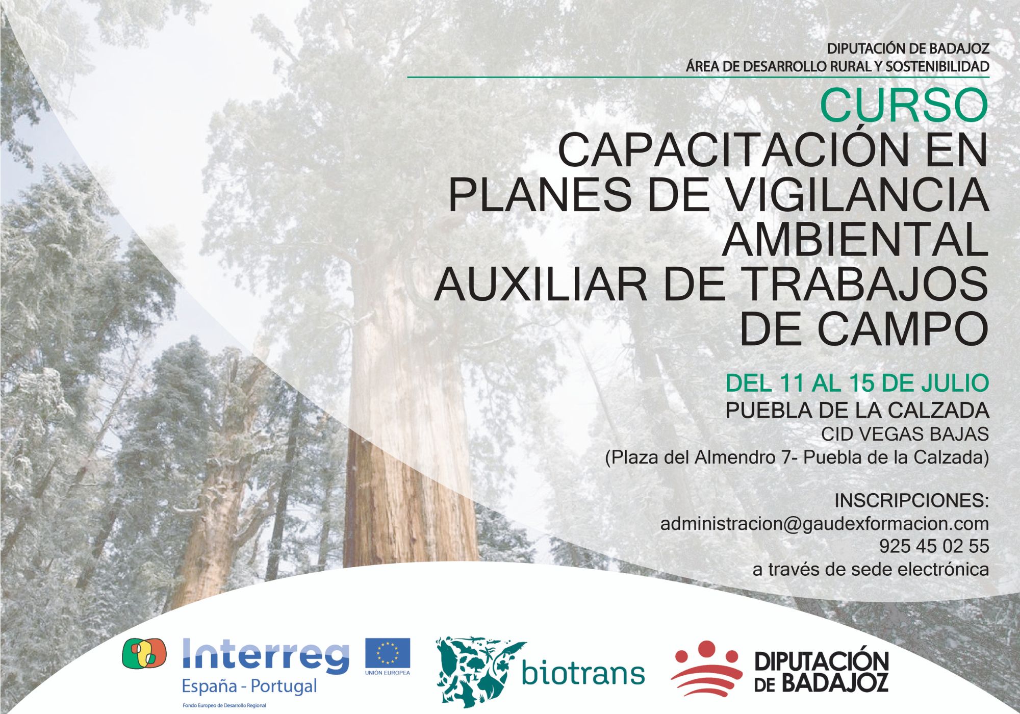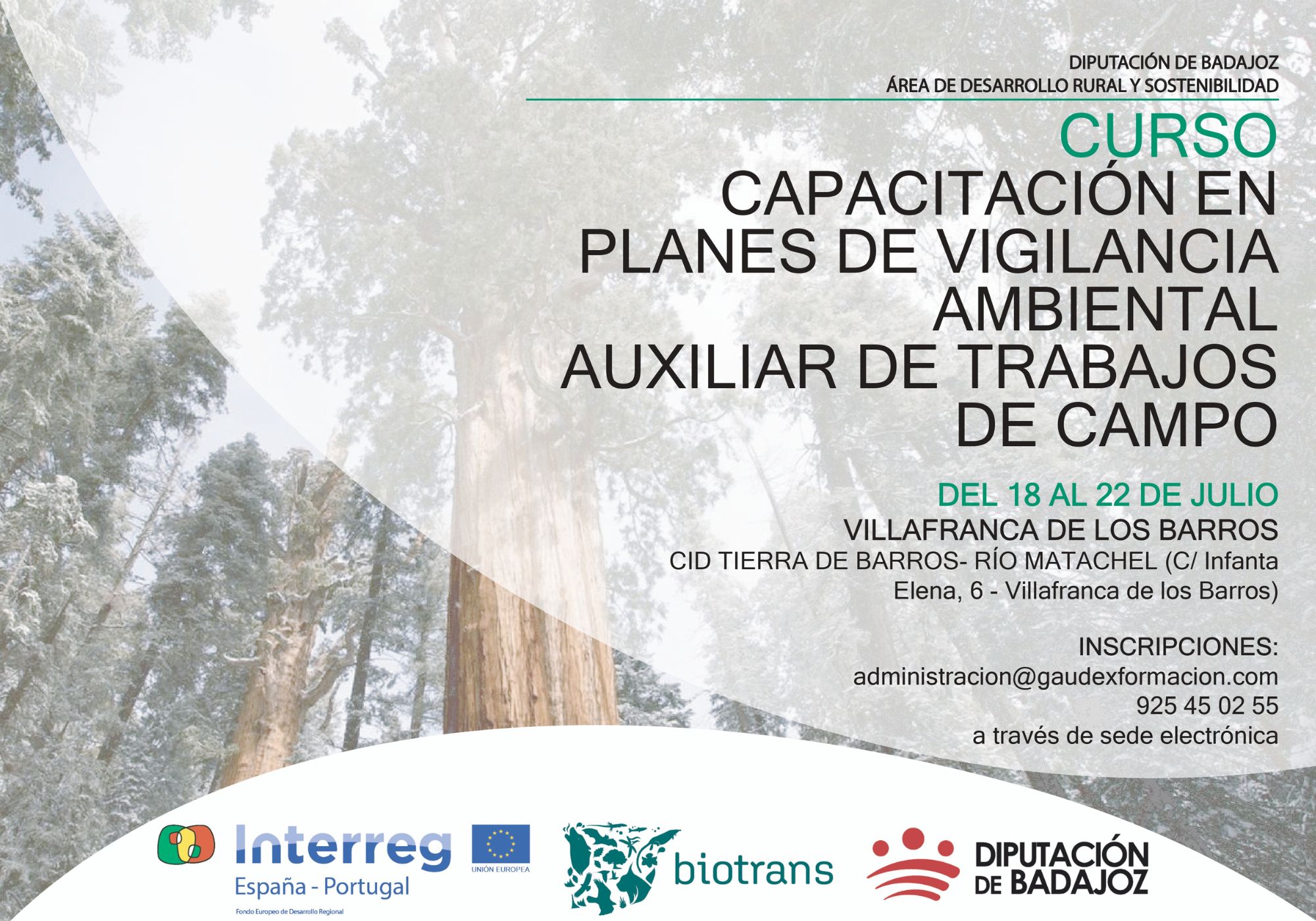 La Diputación de Badajoz, a través del proyecto europeo BIOTRANS “Gestión Integrada de la Biodiversidad en el Área Transfronteriza”, desarrollado por el Área de Desarrollo Rural, Reto Demográfico y Turismo, a través del Servicio de ODS, Alianzas y Proyectos, va a iniciar la segunda edición de la acción formativa en ‘Capacitación en planes de vigilancia ambiental. Auxiliar en trabajos de campo’ en las localidades de Puebla de la Calzada y en Villafranca de los Barros.
