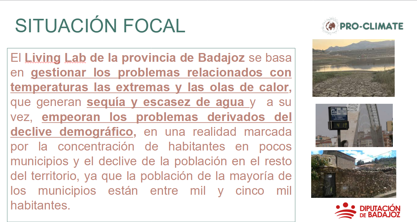 En esta actividad se han abordado tres aspectos fundamentales. En primer lugar, los asistentes han podido comprender las funciones que desempeñan los laboratorios vivientes y la resiliencia climática. Un escenario que ha servido para poner sobre la mesa los problemas locales y oportunidades que ofrece la provincia de Badajoz, así como, han logrado definirse los roles de los actores locales interesados en participar en el Laboratorio viviente de la provincia de Badajoz.