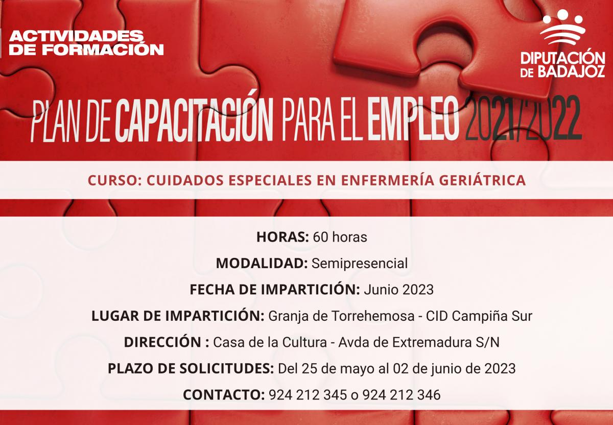 La Diputación de Badajoz, a través del Plan de Capacitación para el Empleo 2021-2022, desarrollado por el Servicio de Capacitación para el Empleo, dependiente del Área de Desarrollo Rural, Reto Demográfico y Turismo de la Diputación de Badajoz, abre el plazo de solicitudes para participar en la acción formativa gratuita en ‘‘Cuidados especiales en enfermería geriátrica’’, que comenzará el próximo mes de junio en la Casa de la Cultura de Granja de Torrehermosa.