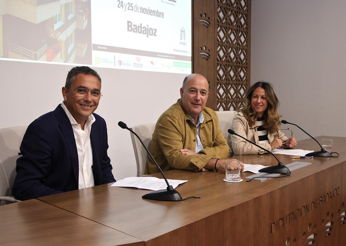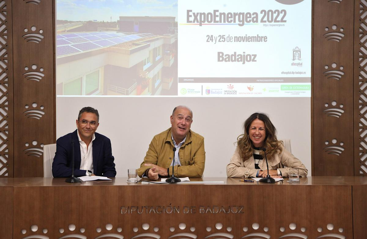 El diputado delegado del Área de Desarrollo Rural, Reto Demográfico y Turismo de la Diputación de Badajoz, Lorenzo Molina; el presidente del Clúster de la Energía de Extremadura, Vicente Sánchez; y la Vicepresidenta del Clúster, Ana Isabel Ruiz, han presentado en rueda de prensa las principales novedades de la sexta edición de Expoenergea, la feria de referencia profesional del sector energético de Extremadura.