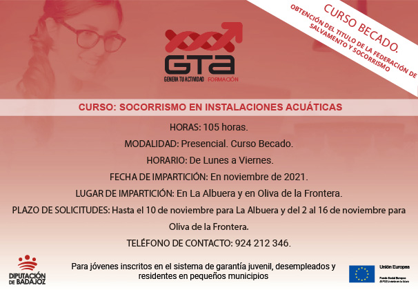 La Diputación de Badajoz, a través del Proyecto GTA Formación (Genera Tu Actividad), desarrollado por el Servicio de Capacitación para el Empleo, va a realizar dos ediciones de la acción formativa ‘’Socorrismo en instalaciones acuáticas’’ en los municipios de La Albuera y Oliva de la Frontera, pertenecientes a los CID de Tierra de Barros y Sierra Suroeste respectivamente.
