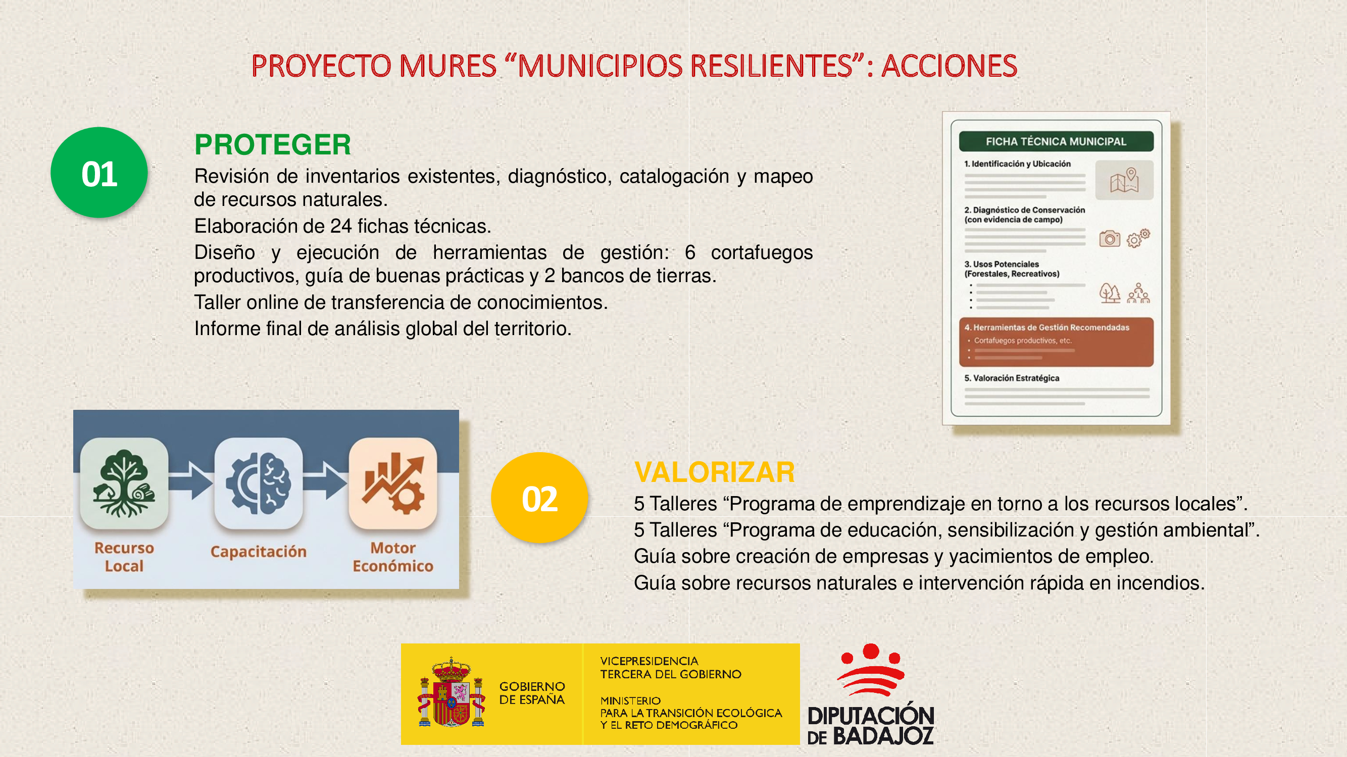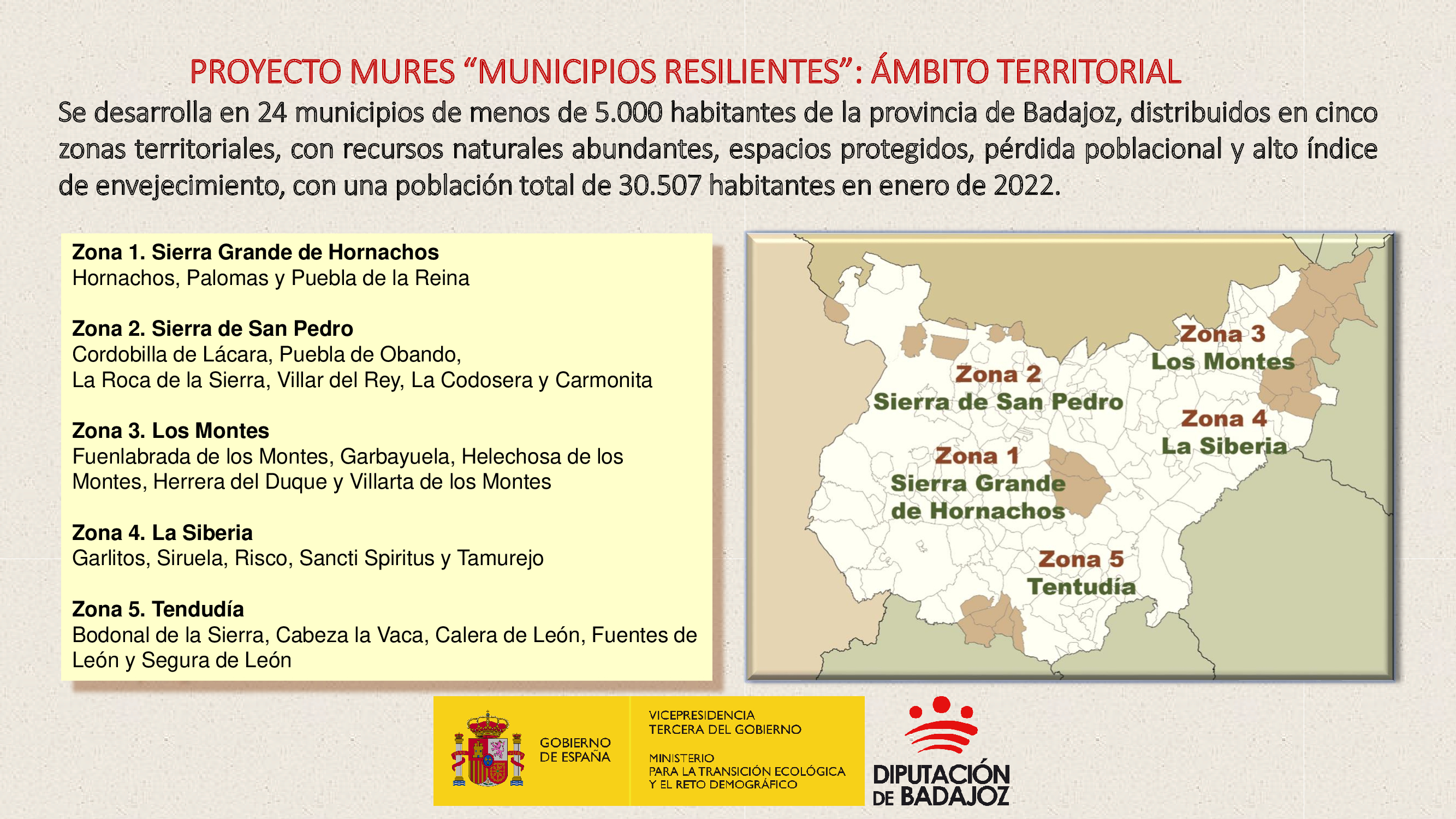 MURES tiene como ámbito de actuación 24 municipios de menos de 5.000 habitantes que suman algo más de 30.500 residentes, situados en cinco zonas forestales de la provincia —Sierra Grande de Hornachos, Sierra de San Pedro, Los Montes, La Siberia y Tentudía— caracterizadas por su alto riesgo de incendio y, en su mayoría, integradas en la Red Natura 2000.