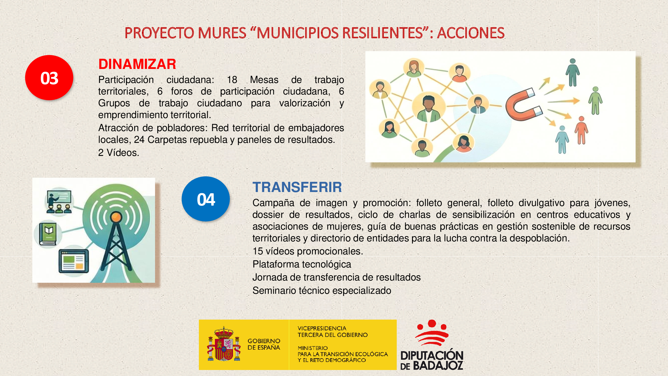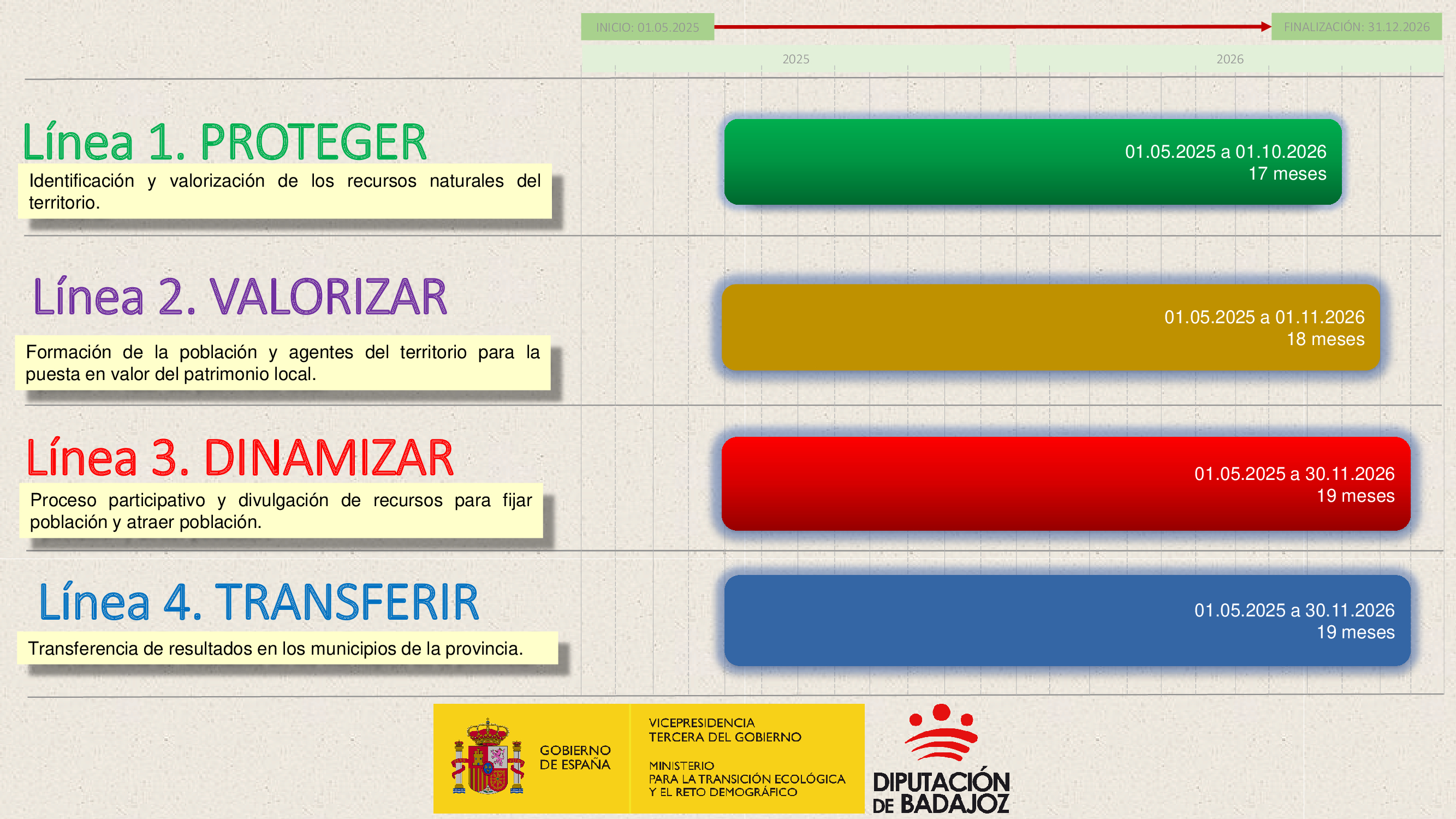 La ejecución comenzó en mayo de 2025 y se prolongará hasta diciembre de 2026. Además, contempla acciones de transferencia de resultados para extender su impacto a otros municipios de la provincia de Badajoz, al conjunto de la Comunidad Autónoma de Extremadura y al territorio nacional.