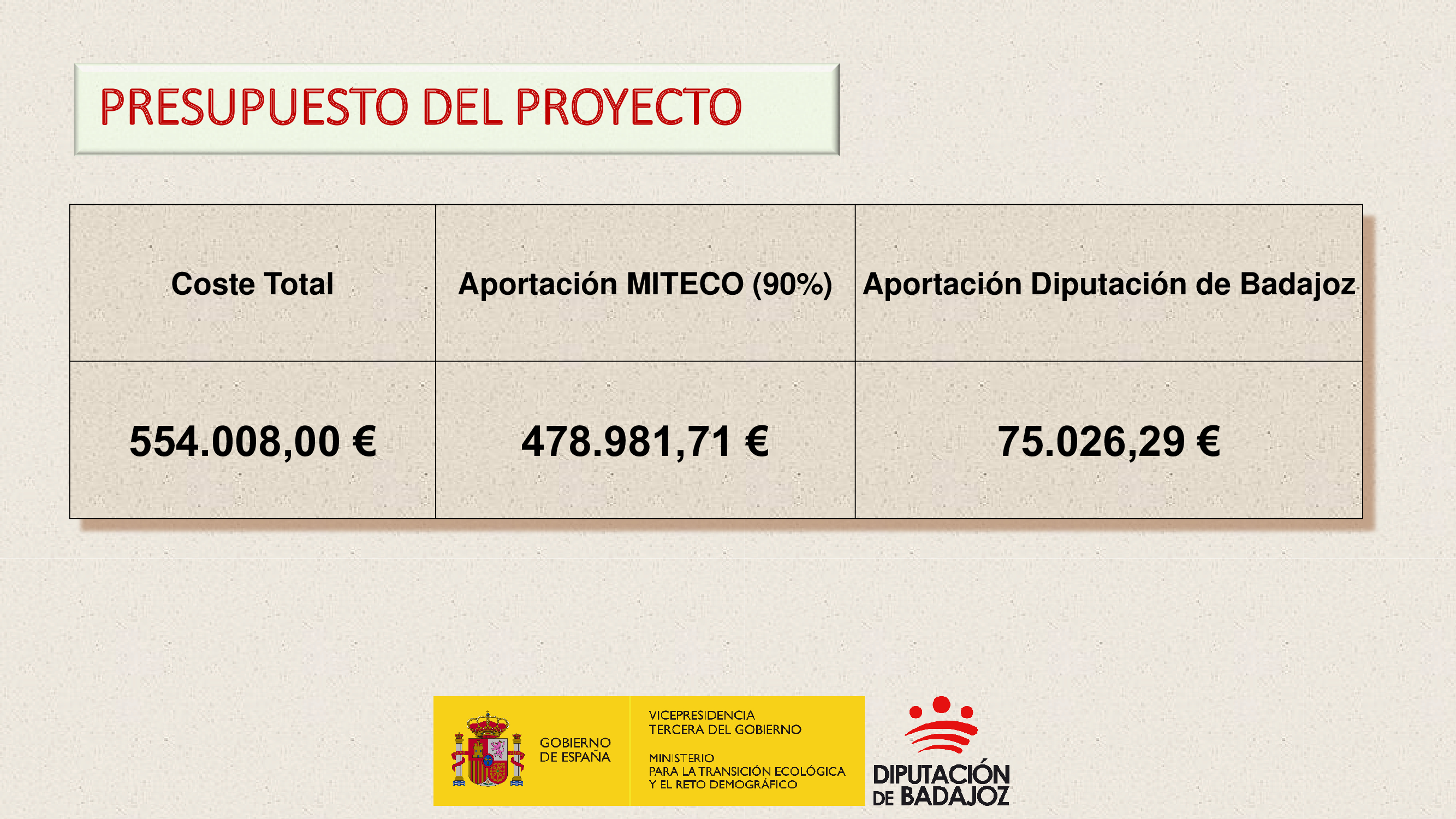 El presupuesto total del proyecto asciende a 554.008 euros, financiados en un 90% por el Ministerio para la Transición Ecológica y el Reto Demográfico y en un 10% por la Diputación de Badajoz.