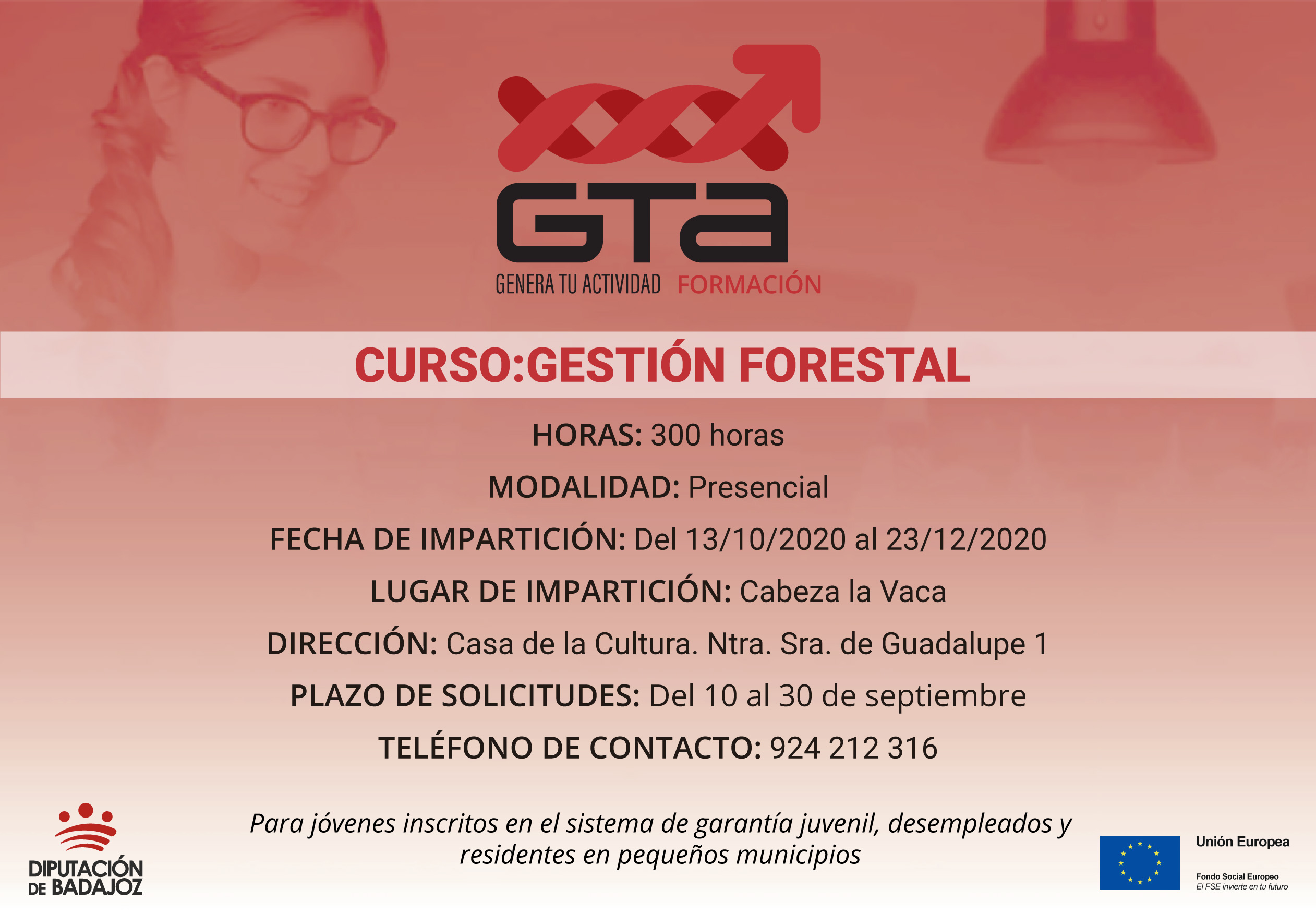 La Diputación de Badajoz, a través del Proyecto GTA Formación (Genera Tu Actividad), impulsado por el Área de Desarrollo Rural, Reto Demográfico y Turismo y la Oficina de Proyectos Europeos, va a iniciar un curso de formación de "Gestión Forestal" en la Casa de Cultura de Cabeza la Vaca, perteneciente al territorio CID Tentudía.