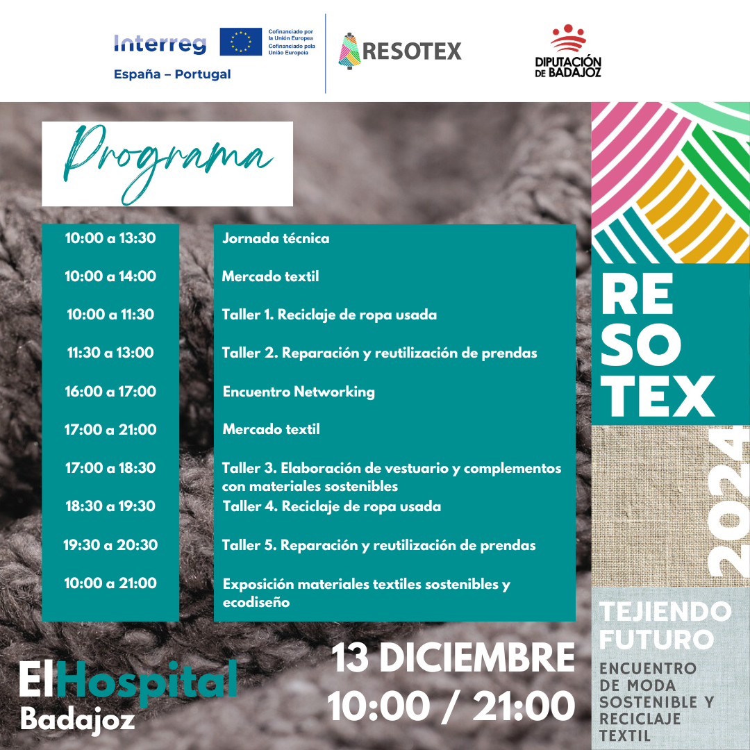 En el marco de esta iniciativa, el 13 de diciembre en el Hospital Centro Vivo de Badajoz la Institución Provincial organiza el primer evento bajo el lema: “Tejiendo Futuro: encuentro de moda sostenible y reciclaje textil”. Una jornada dirigida a empresas, emprendedores, diseñadores, artesanos, artistas, expertos y aficionados del sector, que tiene por objetivo promocionar las iniciativas y la innovación en moda sostenible, concienciar sobre el reciclaje textil, fomentar la producción y el consumo responsables y crear sinergias dentro del sector entre Extremadura y el país luso.
