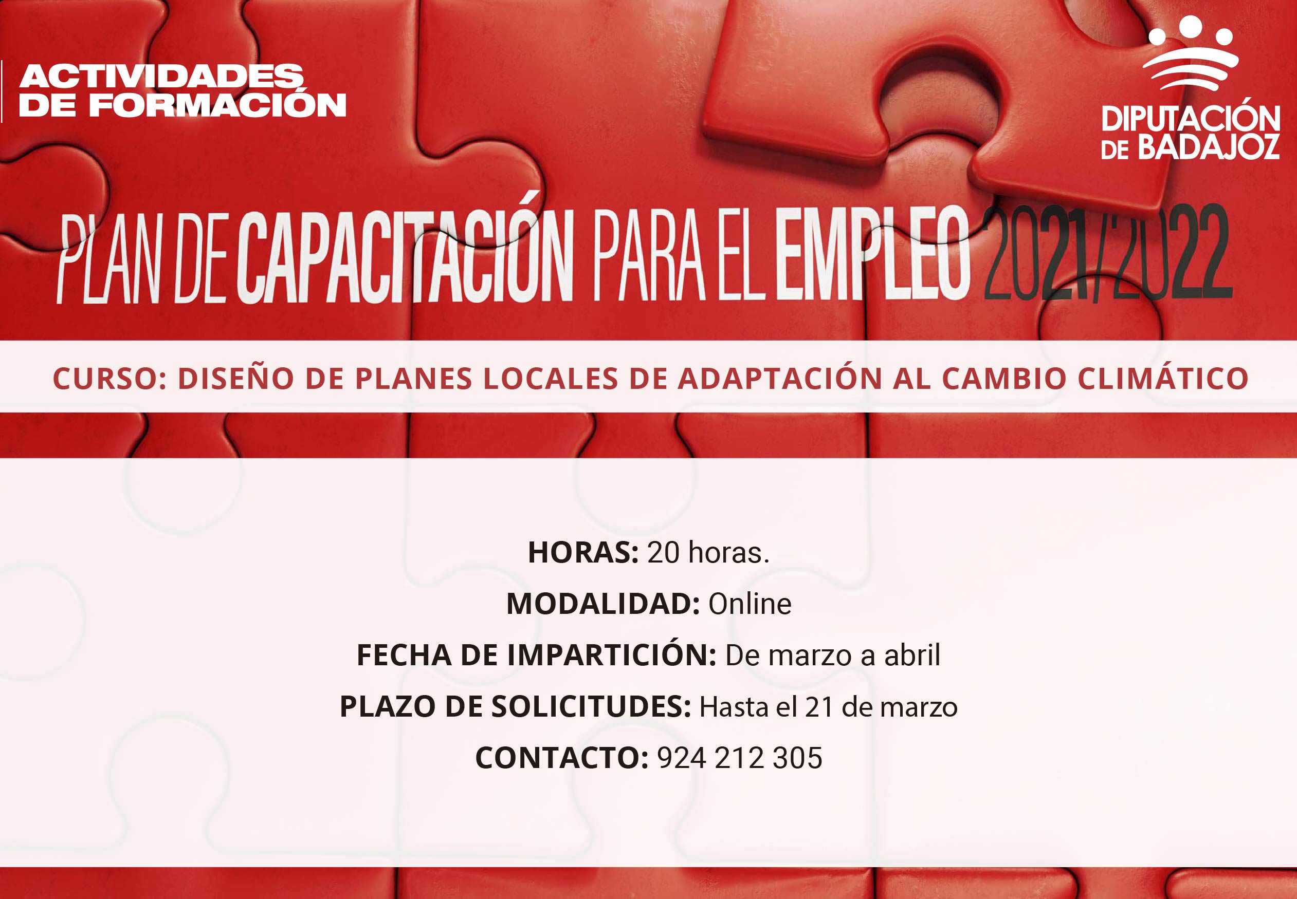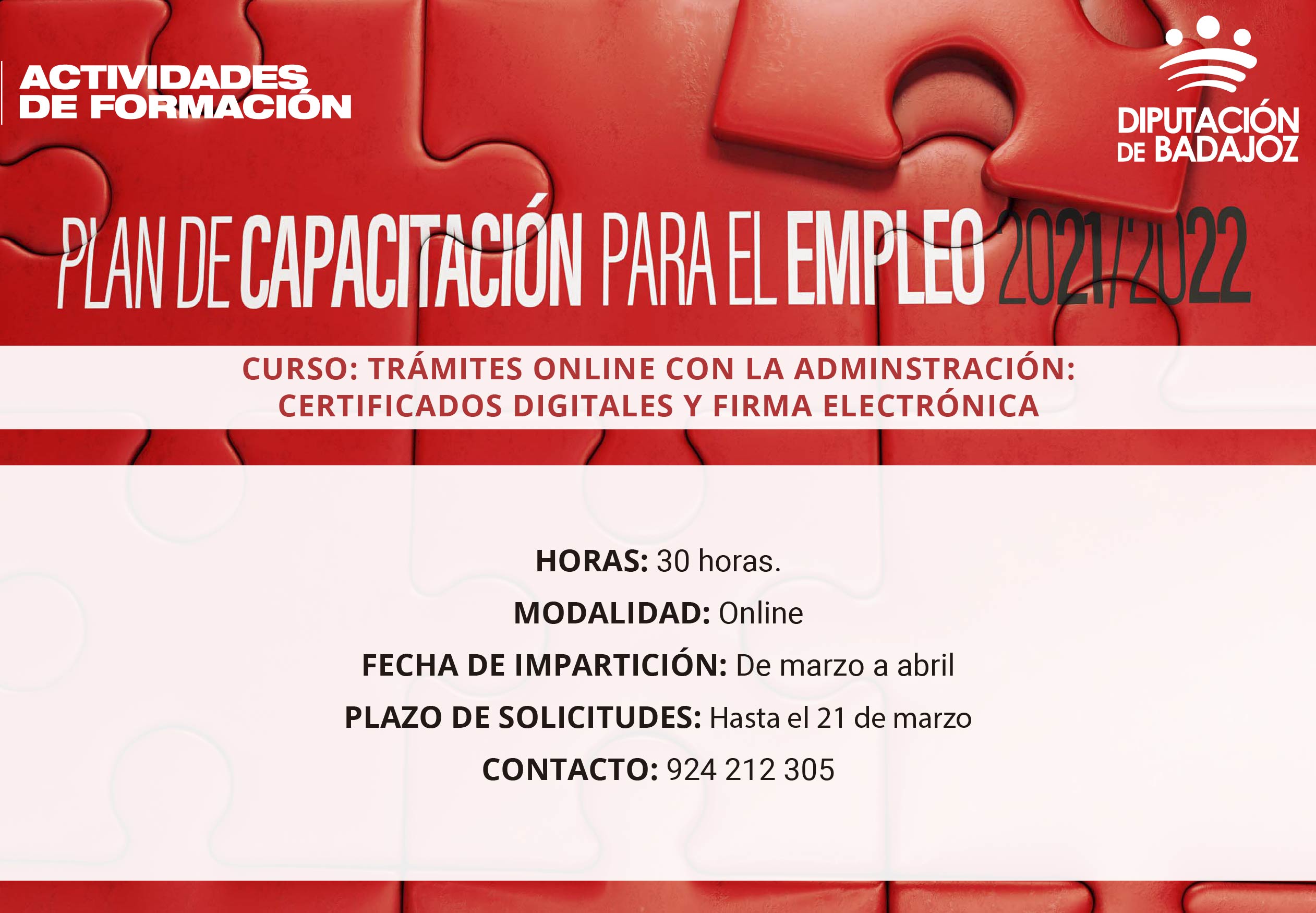 La Diputación de Badajoz, a través del Plan de Capacitación para el Empleo 21-22, desarrollado por el Servicio de Capacitación para el Empleo, dependiente del Área de Desarrollo Rural, Reto Demográfico y Turismo, va a iniciar dos acciones formativas, un curso de ‘’Trámites online con la administración. Certificados digitales y firma electrónica’’, y un curso de ‘’Diseño de planes de adaptación al cambio climático’’.