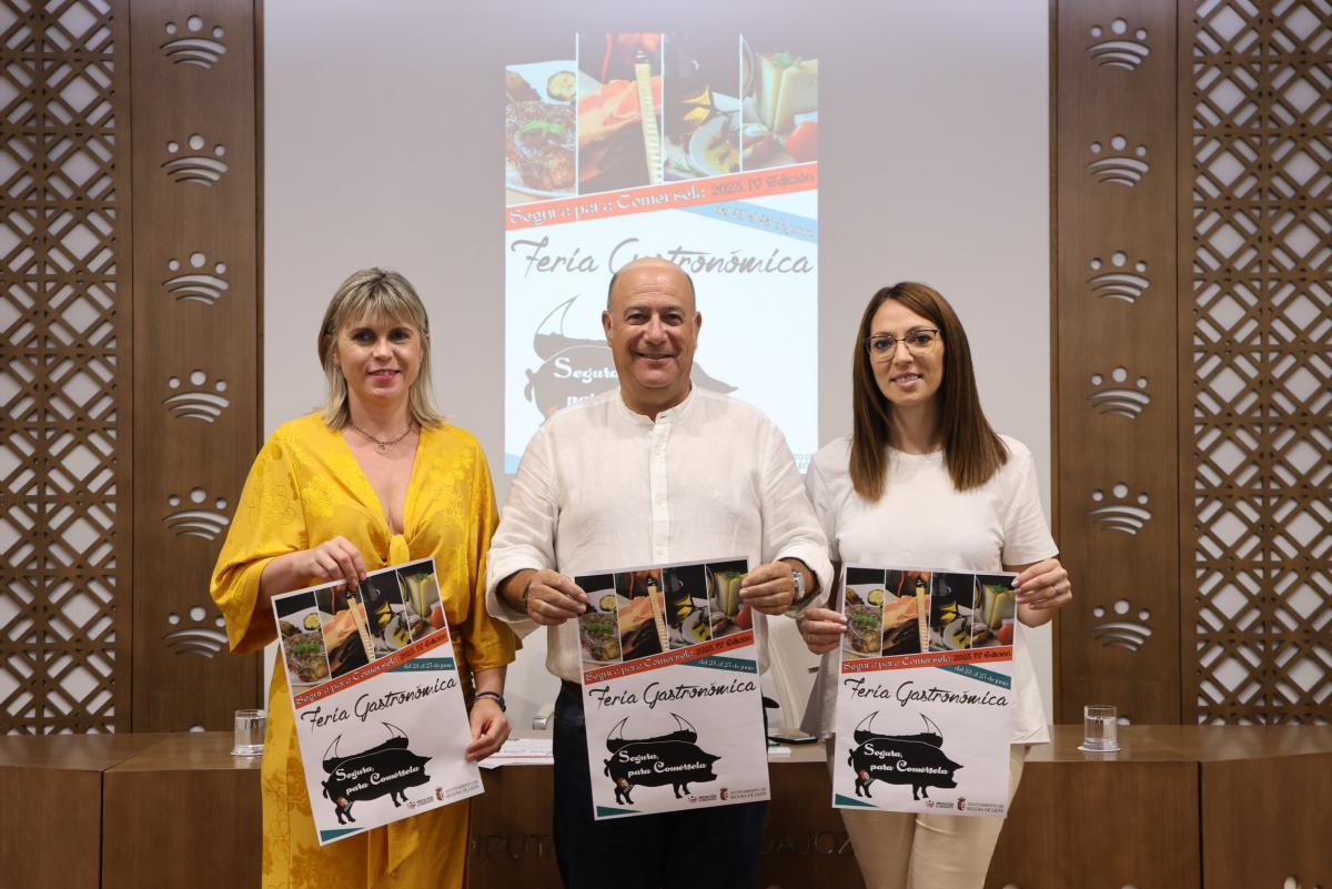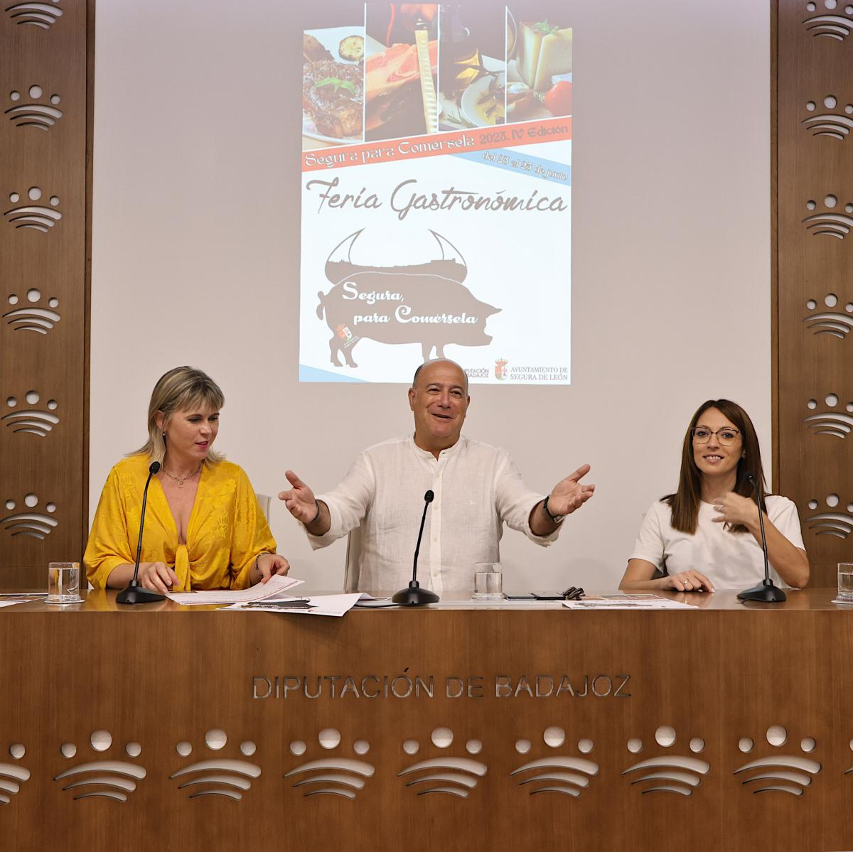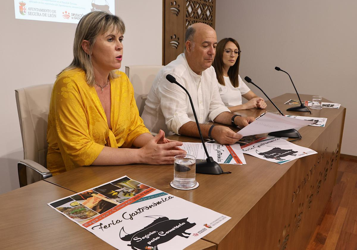 La localidad de Segura de León acogerá la cuarta edición de la Feria Gastronómica 'Segura, para comérsela' del 23 al 25 de junio. Así la han presentado esta mañana el diputado delegado en funciones del Área de Desarrollo Rural, Reto Demográfico y Turismo de la Diputación de Badajoz, Lorenzo Molina, acompañado por la alcaldesa del municipio Isabel Garduño.