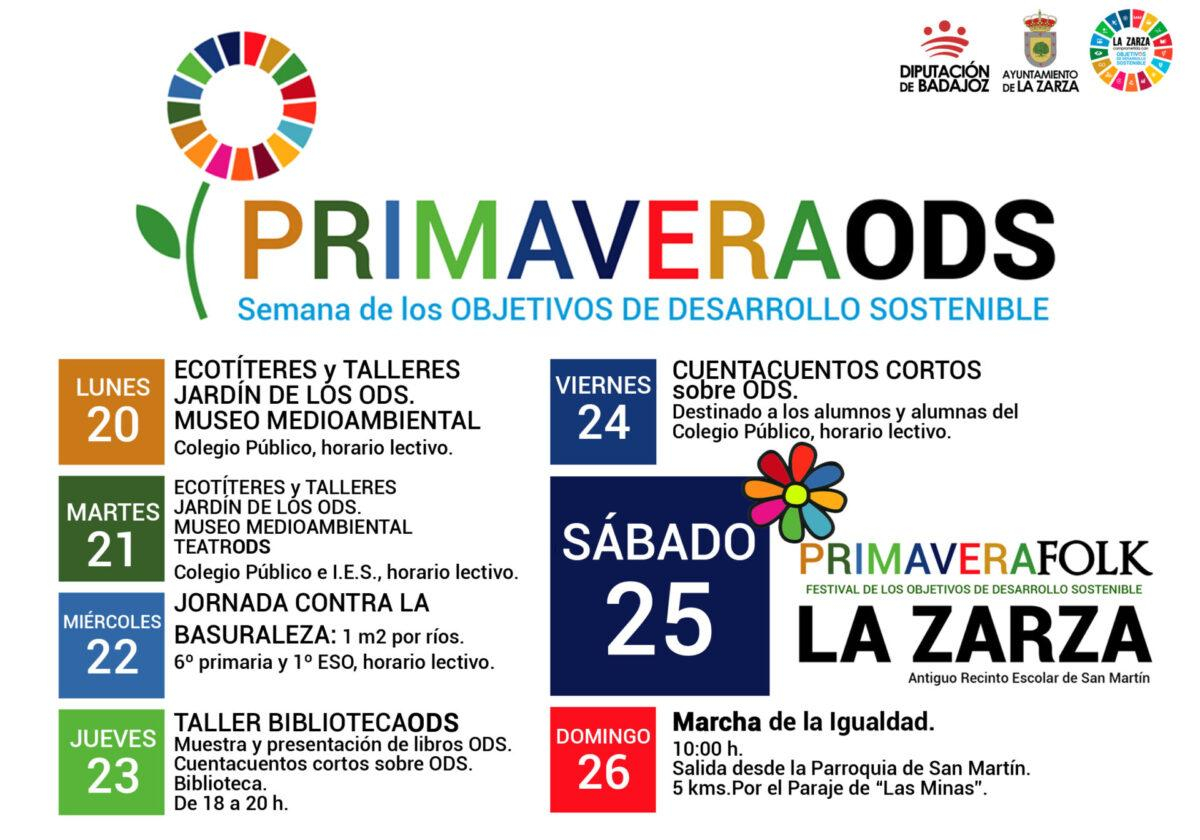 La segunda edición de la Semana de los Objetivos de Desarrollo Sostenible (ODS) de La Zarza, ha comenzado esta semana. Organizada por el ayuntamiento de La Zarza y con patrocinio de la Diputación de Badajoz, ha programado diversas actividades didácticas y participativas, que indirectamente versarán sobre los 17 objetivos de desarrollo sostenible, pero que directamente, tratarán 13 de ellos.