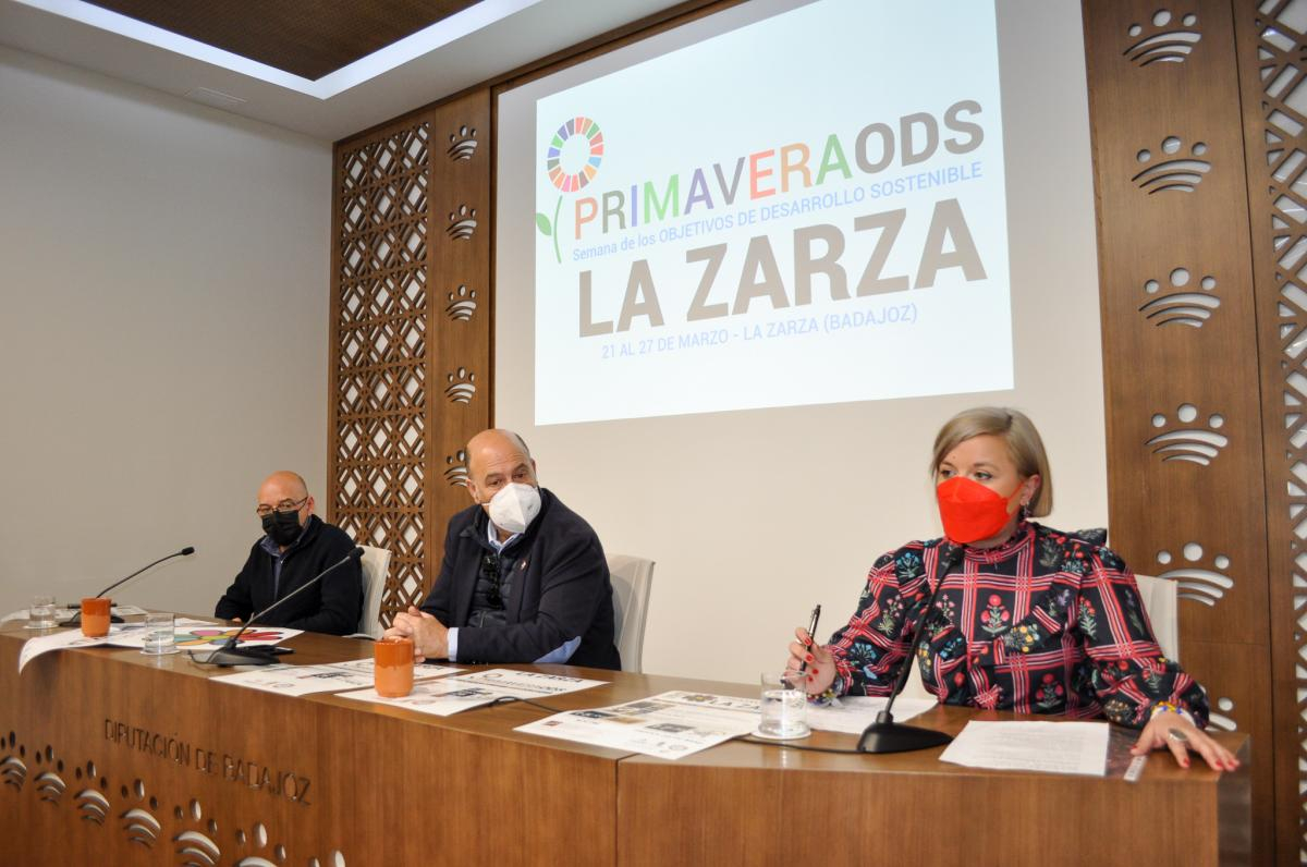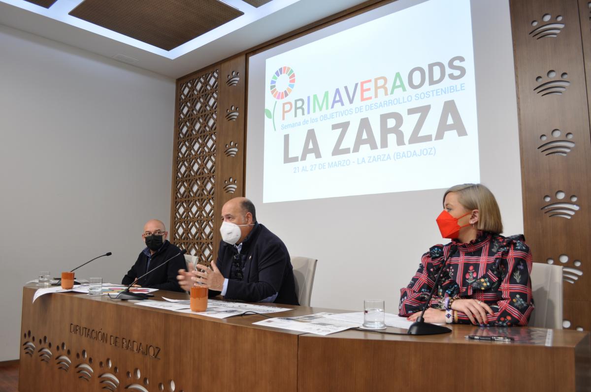Esta mañana ha tenido lugar la presentación en sala de prensa de la primera edición de la semana de los Objetivos de Desarrollo Sostenible que tendrá lugar en el municipio de La Zarza desde el 21 al 27 de marzo. En la presentación han estado presentes Lorenzo Molina, diputado delegado del Área de Desarrollo Rural, Reto Demográfico y Turismo, Francisco Farrona, alcalde de La Zarza y diputado delegado del Área de Fomento, y Sara Jiménez, concejala de Cultura e Igualdad del Ayuntamiento de La Zarza.