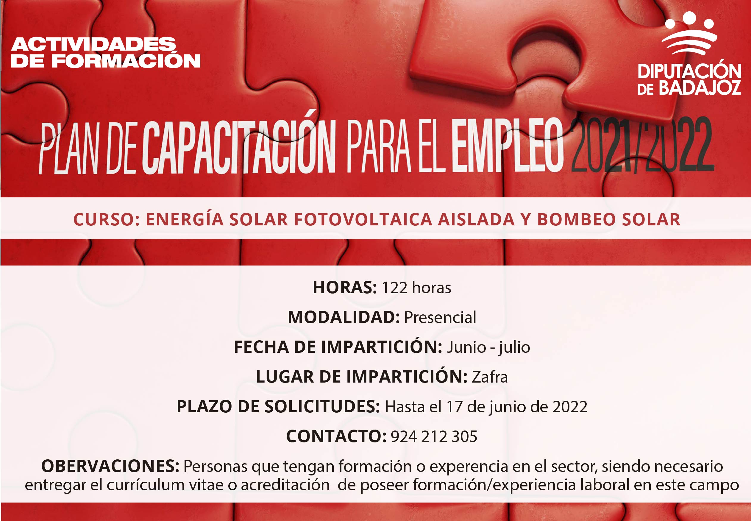 La Diputación de Badajoz, a través del Plan de Capacitación para el Empleo Local 2021-2022, desarrollado por el Servicio de Capacitación para el Empleo, dependiente del Área de Desarrollo Rural, Reto Demográfico y Turismo de la Diputación de Badajoz, va a iniciar una acción formativa en ‘’Energía solar fotovoltaica aislada y bombeo solar’’ en la localidad de Zafra.