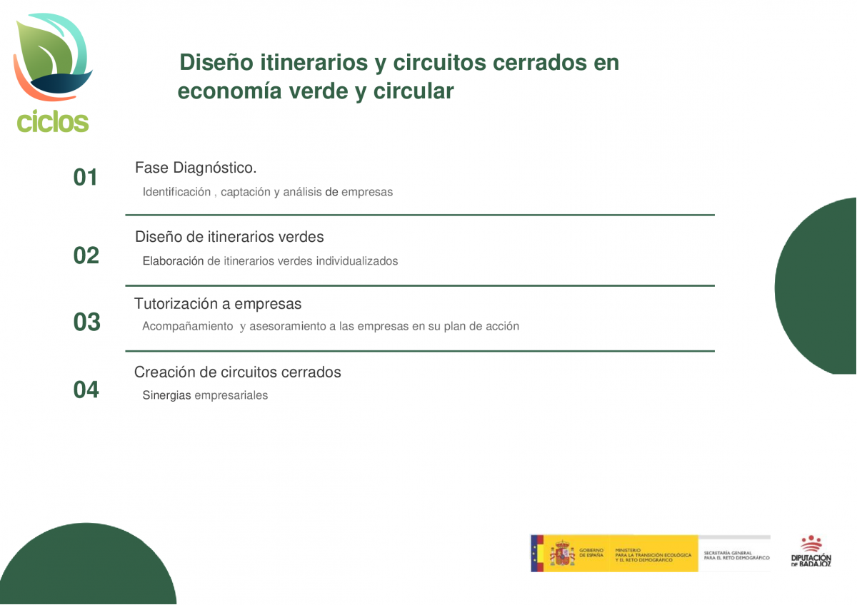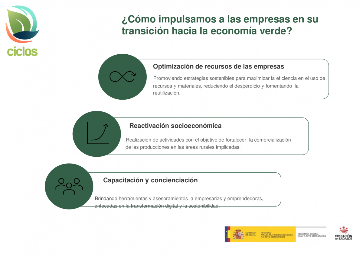 En línea con estos esfuerzos, la Diputación de Badajoz también ha lanzado un innovador servicio de consultoría para empresas rurales dentro del mismo proyecto CICLOS. Este servicio, denominado "Itinerarios Verdes y Circuitos Cerrados", proporciona a las PYMES un plan detallado y personalizado para la transición hacia modelos de negocio más sostenibles.