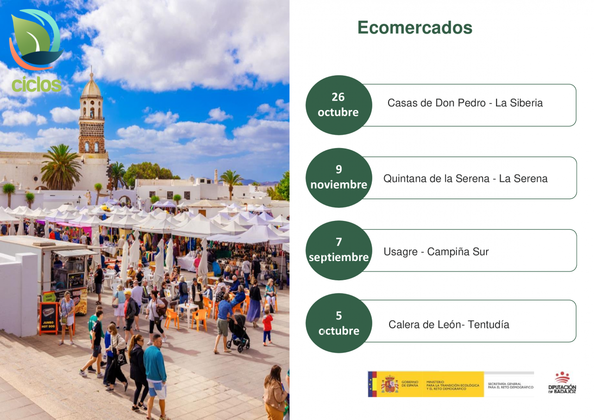 La Diputación de Badajoz, a través del Área de Desarrollo Rural, Reto Demográfico y Turismo, organizan cuatro Ecomercados que se enmarcan dentro del proyecto CICLOS, acrónimo de Circularidad, Innovación y Comercialización Sostenible. Está financiado por el Ministerio para la Transición Ecológica y el Reto Demográfico y la Diputación de Badajoz y tiene un presupuesto total de 276.714,44€, de los cuales un 90% es aportado por el Ministerio, y el 10% restante por la Institución Provincial.