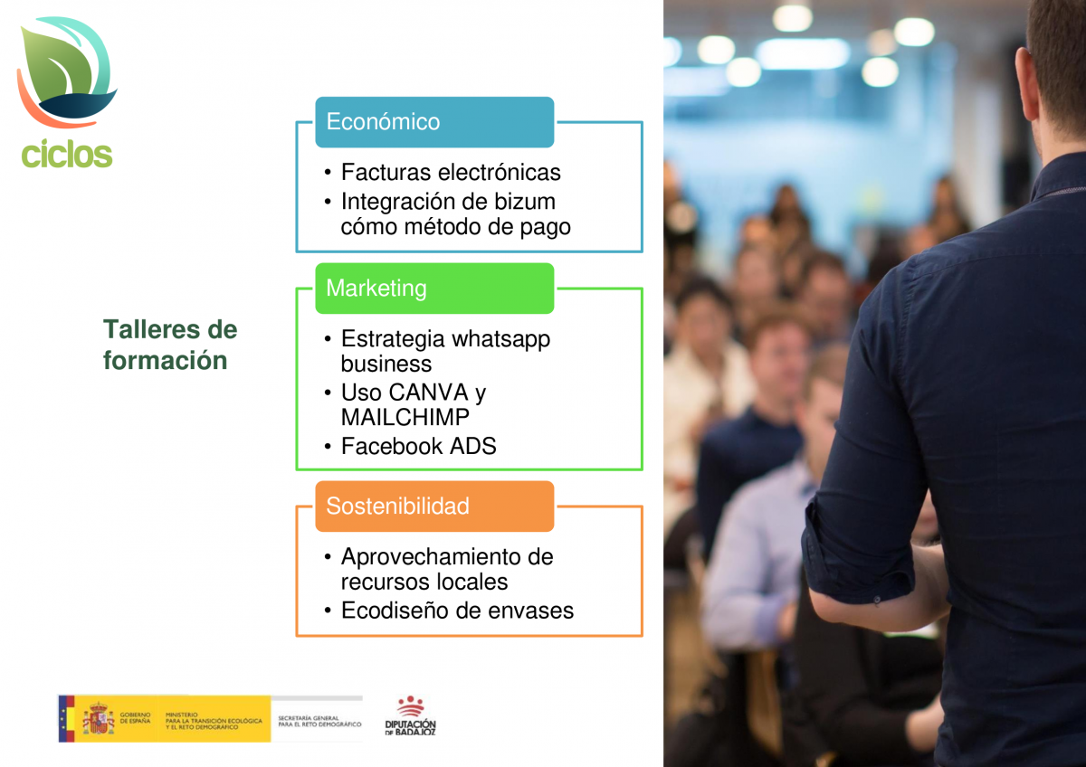 Con este fin se realizarán, además, cuatro talleres en cada una de las comarcas implicadas, La Siberia, La Serena, Campiña Sur y Tentudía, abarcando temas como la integración de Bizum como método de pago, el uso de estrategias de WhatsApp Business, el uso de Canva y Mailchimp en empresas, herramientas gratuitas de facturación electrónica y la creación de campañas publicitarias con Facebook Ads. Además, se llevarán a cabo dos talleres generales para todo el territorio implicado, centrados en el aprovechamiento de recursos locales y el ecodiseño para envases.