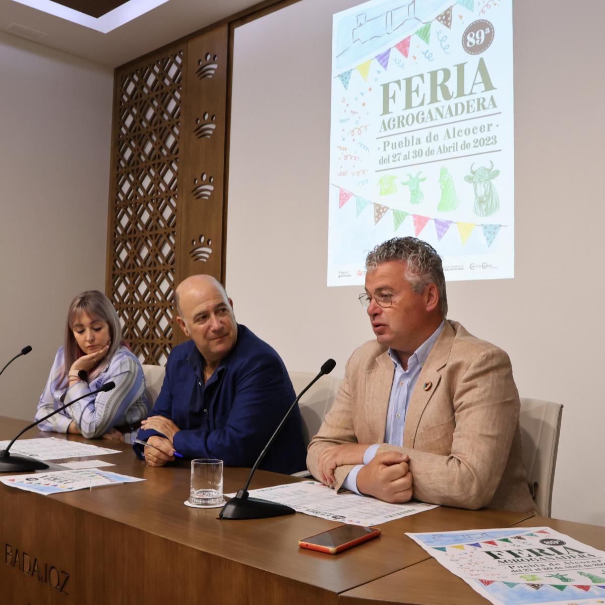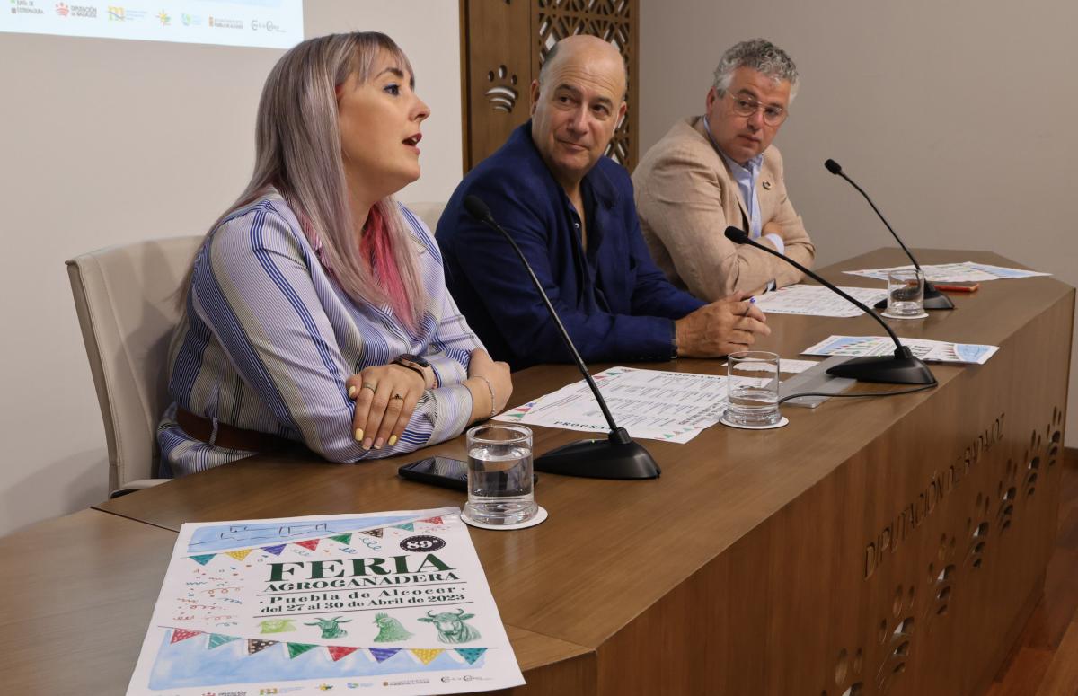 El diputado delegado del Área de Desarrollo Rural, Reto Demográfico y Turismo, Lorenzo Molina, acompañado del alcalde y la teniente alcalde de Puebla de Alcocer, Manuel Moreno y María Dolores Fernández, ha presentado esta mañana en la sala de prensa de Diputación de Badajoz la nueva edición de la 89ª Feria Agroganadera de Puebla de Alcocer, que tendrá lugar del 27 al 30 de abril.
