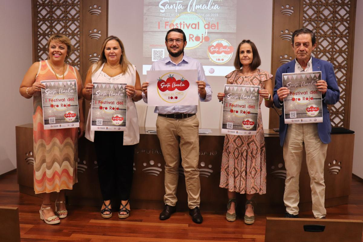 El diputado de Desarrollo Rural, Reto Demográfico y Turismo, Francisco Buenavista, acompañado por la alcaldesa de Santa Amalia, Raquel Castaño, y María Elena Ríos, representante del AMPA del Instituto Sierra La Mesta, presentó hoy el I Festival Oro Rojo dedicado al tomate. Este evento está financiado por la Diputación de Badajoz en el marco de los Presupuestos Provinciales Participativos.