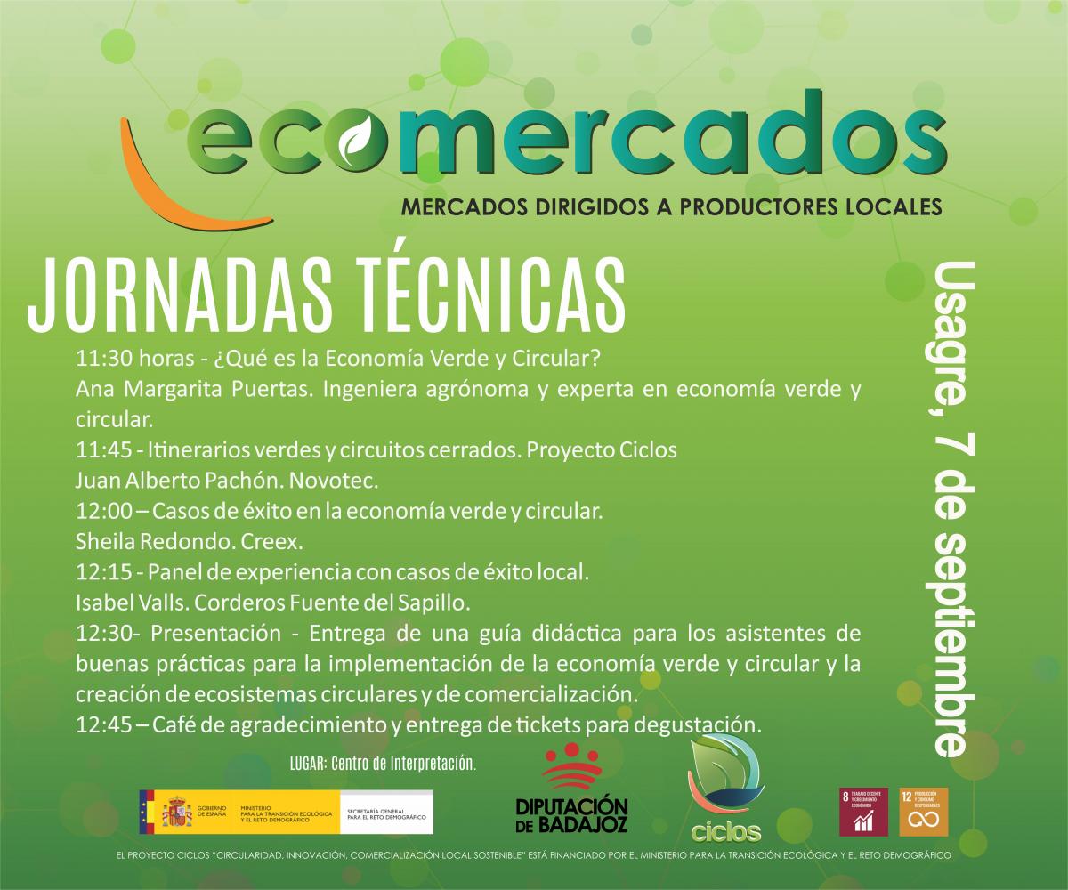 El programa del Ecomercado inicia en Usagre el próximo 7 de septiembre, e incluirá una serie de eventos y actividades gratuitas a lo largo del día tanto para los productores locales expositores como el público general. El sábado comenzará con un desayuno saludable y una sesión de coworking para productores a las 8:00 h en el salón de la piscina municipal, seguido por el montaje de los stands en la plaza de la localidad. La apertura oficial del Ecomercado tendrá lugar a las 10:30 h con música y una presentación por parte del speaker, y hasta las 12:30 h el Centro de Interpretación de Usagre acogerá jornadas técnicas, mientras que en la plaza del Ecomercado se ofrecerán talleres de educación ambiental en dos sesiones simultáneas y una demostración de cocina en vivo. Posteriormente, de 13:30 h a 15:30 h, se disfrutará de un concierto y música en directo en el escenario. El evento concluirá a las 18:00 h con una ceremonia de cierre.