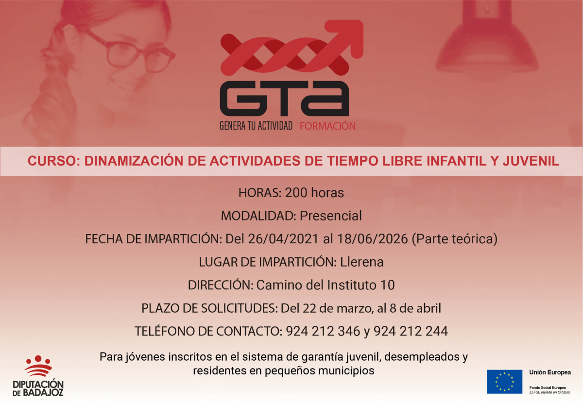 La Diputación de Badajoz, a través del Proyecto GTA Formación (Genera Tu Actividad), desarrollado por el Servicio de Capacitación para el Empleo, dependiente del Área de Desarrollo Rural, Reto Demográfico y Turismo y en colaboración con la Oficina de Proyectos Europeos, va a iniciar un curso de formación de "Dinamización de actividades de tiempo libre infantil y juvenil" en Llerena, perteneciente al territorio CID Campiña Sur.